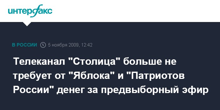 Москва. 5 ноября. INTERFAX.RU – Московский телеканал "Столица" снял свои требования к партиям "Яблоко" и "Патриоты России" оплатить эфир, предоставленный им перед выборами в Госдуму в 2007-м году.