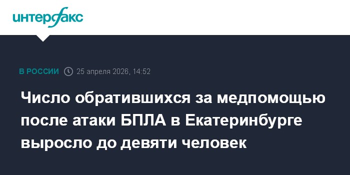 Москва. 25 апреля. INTERFAX.RU - За медицинской помощью после атаки БПЛА на жилой дом в Екатеринбурге обратились девять человек, сообщил в субботу губернатор Свердловской области Денис Паслер.