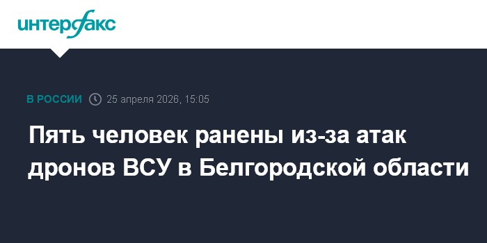 Москва. 25 апреля. INTERFAX.RU - Атаки украинских беспилотников в Белгородской области привели к ранениям пяти человек и отключению энергоснабжения в части областного центра, сообщил губернатор региона Вячеслав Гладков в субботу.