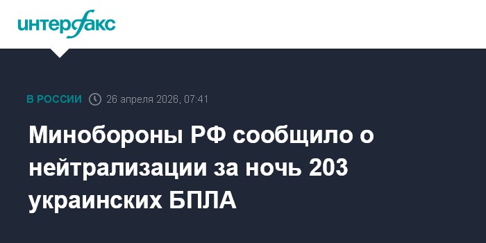 Москва. 26 апреля. INTERFAX.RU - В период с 20:00 по Москве 25 апреля до 7:00 по Москве 26 апреля дежурными средствами ПВО перехвачены и уничтожены 203 украинских беспилотных летательных аппарата самолетного типа в регионах России и над Черным морем, сообщили в министерстве обороны РФ.