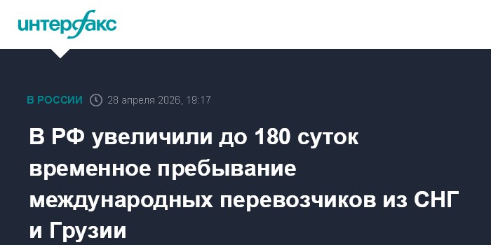 Москва. 28 апреля. INTERFAX.RU - Правительство РФ увеличило до 180 суток в течение одного календарного года срок временного пребывания на территории Российской Федерации водителей, осуществляющих международные автомобильные перевозки, из стран СНГ и Грузии.