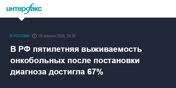 Москва. 28 апреля. INTERFAX.RU - Министр здравоохранения РФ Михаил Мурашко сообщил об историческом максимуме - 67% заболевших онкологическим заболеванием выживают в течение пяти лет с момента постановки диагноза.