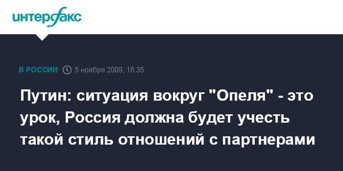 Москва. 5 ноября. INTERFAX.RU - Ситуация вокруг сделки по "Опелю" - это урок для России, и его необходимо будет учитывать в будущем, заявил премьер-министр РФ Владимир Путин.