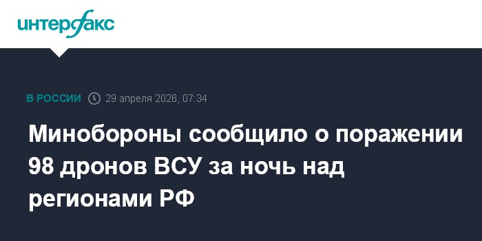 Москва. 29 апреля. INTERFAX.RU - Дежурными средствами ПВО с 20:00 вторника до 7:00 среды над регионами России перехвачены и уничтожены 98 украинских беспилотников самолетного типа, сообщает Минобороны РФ.