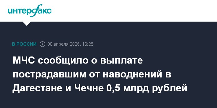Москва. 30 апреля. INTERFAX.RU - В Дагестане и Чечне 17 145 пострадавшим от наводнений выплачено уже более 0,5 млрд рублей, выплаты продолжаются, заявил начальник управления территориальной политики МЧС Александр Молчанов. Он заявил об этом на заседании правкомиссии по предупреждению и ликвидации последствий ЧС.