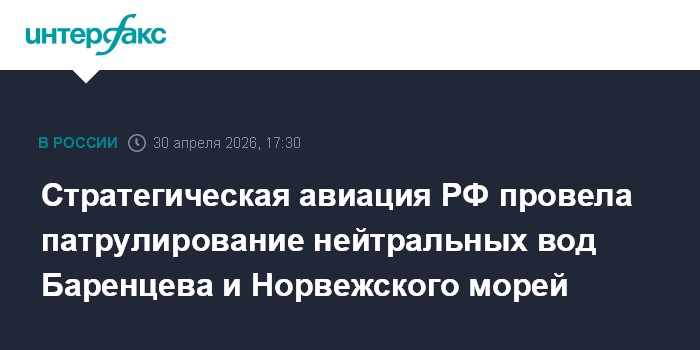 Москва. 30 апреля. INTERFAX.RU - Российские стратегические бомбардировщики-ракетоносцы Ту-95МС выполнили плановый семичасовой полет над нейтральными водами Баренцева и Норвежского морей, сообщило Минобороны РФ в четверг.