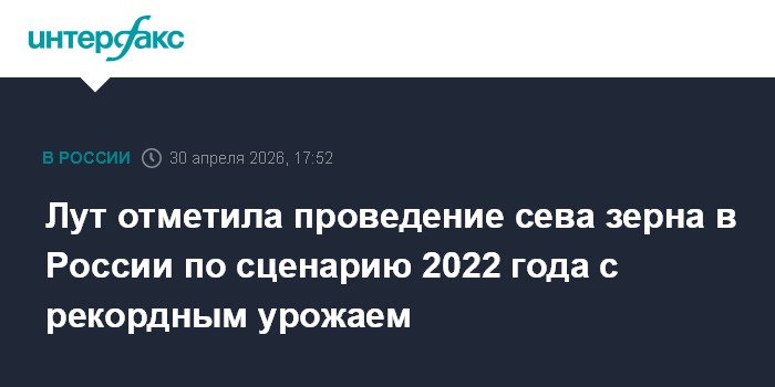 Москва. 30 апреля. INTERFAX.RU - Сев зерна в 2026 году идет тяжело из-за непогоды, но условия напоминают 2022 год, когда был получен рекордный урожай в 157 млн тонн, заявила журналистам глава Минсельхоза Оксана Лут в ходе поездки в Ставропольский край.