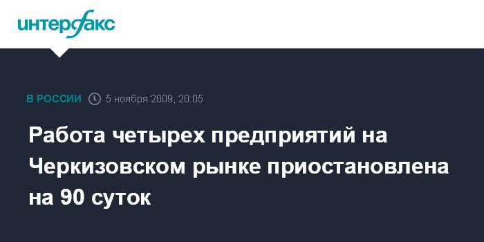 Москва. 5 ноября. INTERFAX.RU - Измайловский суд Москвы приостановил еще на 90 суток деятельность четырех предприятий, расположенных на территории Черкизовского рынка в связи с нарушениями противопожарной безопасности.