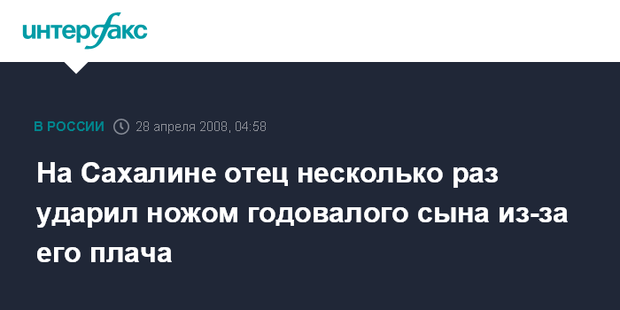 Как сообщает пресс-служба прокуратуры Сахалинской области, 9 августа 2007 года ранее судимый и имеющий непогашенную судимость В.Кащеев, находясь в состоянии алкогольного опьянения, нанес своему годовалому сыну не менее семи ударов ножом в жизненно-важные органы, потому что ребенок своим плачем мешал отцу отдыхать.
