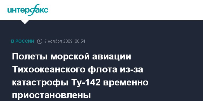 Владивосток. 7 ноября. ИНТЕРФАКС - ДАЛЬНИЙ ВОСТОК - Полеты морской авиации на Тихоокеанском флоте (ТОФ) в связи с падением военного самолета Ту-142 временно прекращены, специальная комиссия приступила в субботу к расследованию причин катастрофы, сообщила в субботу пресс-служба ТОФ.