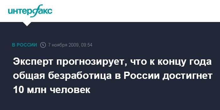 Москва. 7 ноября. ИНТЕРФАКС - Общая численность безработных в России к концу 2009 года возрастет до 10 млн, из которых обратившихся за помощью в службы занятости будет не многим более 20%, считает президент Национальной Ассамблеи специалистов в области труда и социальной политики Николай Волгин.