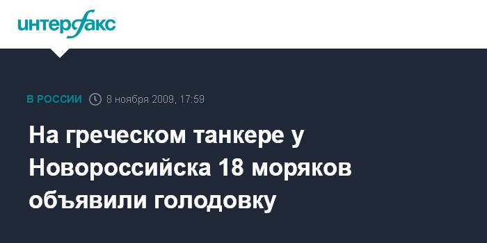 Ростов-на-Дону. 8 ноября. INTERFAX.RU - Экипаж судна "Thelema Т" греческой судоходной компании, стоящий четвертый месяц у Новороссийска, заявил о бессрочной голодовке. "Судовладельцы не выплатили экипажу зарплату за октябрь - мы не намерены покидать судно до полного расчета всех членов экипажа", - заявил в воскресенье агентству "Интерфакс-Юг" офицер экипажа танкера. "18 членов экипажа объявили бессрочную голодовку в знак протеста", - сказал собеседник агентства.