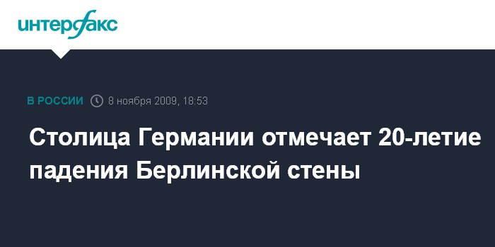Берлин. 8 ноября. INTERFAX.RU - Двадцатилетний юбилей открытия границы между Западной и Восточной Германией и падения Берлинской стены отпразднуют в понедельник в Берлине. Официальная программа довольно обширна. Так, один из бывших пропускных пунктов на границе Восточного и Западного Берлина в районе Борнхольмер штрассе посетит канцлер ФРГ Ангела Меркель. В этом мероприятии также примут участие бывшие лидеры некоторых стран, в частности, экс-президент СССР Михаил Горбачев и экс-президент Польши Лех Валенса. Затем празднования переместятся к Бранденбургским воротам, которые стоят как раз на том месте, где город разрезала стена. Здесь соберутся уже лидеры дня сегодняшнего. Ожидается, в частности, участие президентов России и Франции Дмитрия Медведева и Николя Саркози, госсекретаря США Хиллари Клинтон и многих других. Для них и остальных гостей мероприятия у Бранденбургских ворот будет дан торжественный концерт.