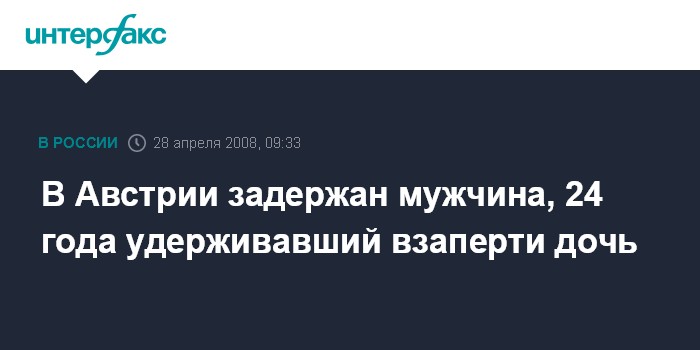Москва. 28 апреля. INTERFAX.RU - Полиция города Амштеттен в Австрии задержала мужчину 73 лет, который в течение 24 лет удерживал в подвале дома свою дочь, регулярно насилуя ее. Как сообщает ВВС, в результате инцеста были рождены семеро детей, выжили только шесть. Пострадавшей женщине сейчас 42 года.