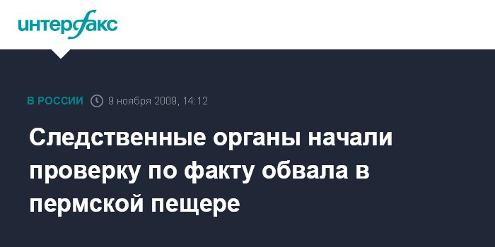 Пермь. 9 ноября. INTERFAX.RU - Губахинский межрайонный следственный отдел следственного управления СКП РФ по Пермскому краю начал проверку по факту обвала в пещере "Российская", где погибли двое спелеологов.