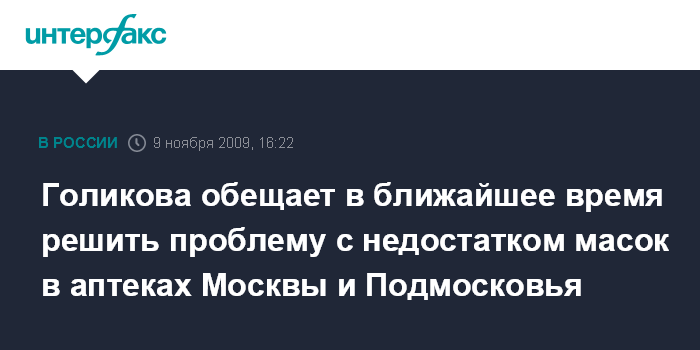 Москва. 9 ноября. INTERFAX.RU - Вопрос с дефицитом противовирусных масок в аптеках московского региона будет решен в ближайшее время, сообщила министр здравоохранения и социального развития РФ Татьяна Голикова.