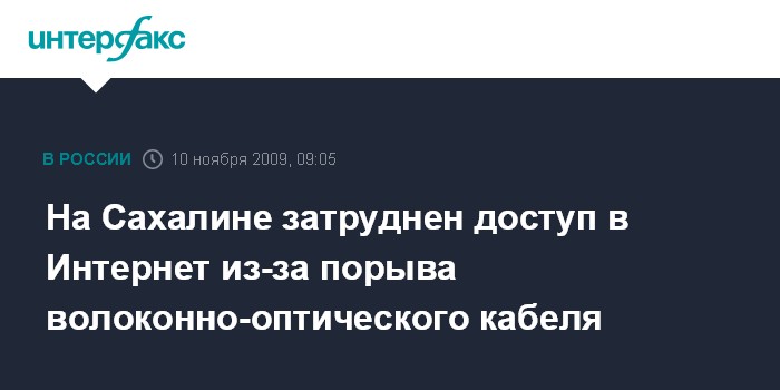Южно-Сахалинск. 10 ноября. INTERFAX.RU - На Сахалине затруднен доступ в сеть Интернет из-за повреждения волоконно-оптического кабеля компании "Транстелеком" (ТТК) в Хабаровском крае.