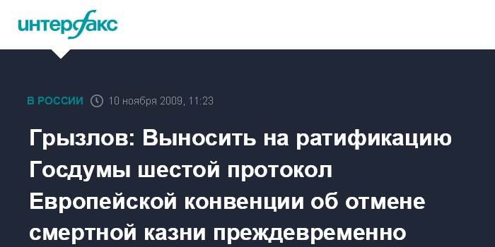 Москва. 10 ноября. INTERFAX.RU - Выносить на ратификацию Госдумы РФ шестой протокол Европейской конвенции по правам человека, касающийся отмены смертной казни, преждевременно, заявил спикер Борис Грызлов.