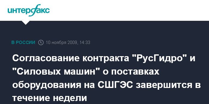 Москва. 10 ноября. INTERFAX.RU - Минэнерго ожидает, что согласование контракта "РусГидро" и "Силовых машин" на поставку оборудования для Саяно-Шушенской ГЭС (СШГЭС) завершится в течение недели. Об этом заявил журналистам министр энергетики РФ Сергей Шматко.