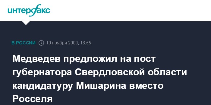 Медведев предложил на пост губернатора Свердловской области кандидатуру Мишарина вместо Росселя