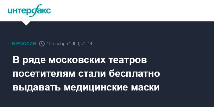 Москва. 10 ноября. INTERFAX.RU - В 17-ти московских театрах зрителям на добровольной основе начали предлагать медицинские маски, сообщила первый заместитель мэра в правительстве Москвы Людмила Швецова в программе "Лицом к городу" на канале "ТВ-Центр" во вторник.