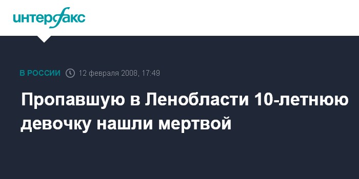 Санкт-Петербург. 12 февраля. INTERFAX.RU - В городе Пикалево Ленинградской области найдено тело 10-летней Hатальи Рубцовой, пропавшей в субботу, сообщил "Интерфаксу" источник в правоохранительных органах.