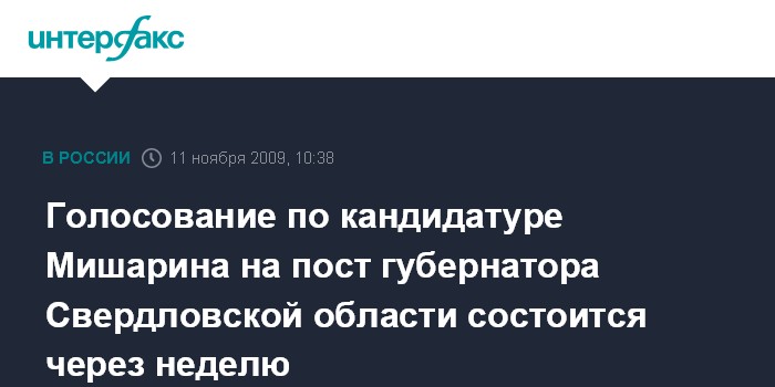 Москва. 11 ноября. INTERFAX.RU – Голосование по утверждению Александра Мишарина губернатором Свердловской области состоится 17 ноября, сообщил в среду журналистам председатель облдумы Законодательного собрания Свердловской области Николай Воронин