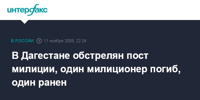 Махачкала. 11 ноября. ИНТЕРФАКС - Один милиционер убит, один получил ранения в результате обстрела поста милиции вечером в среду на окраине города Хасавюрт в Дагестане, сообщили "Интерфаксу" в пресс-службе МВД по Дагестану.