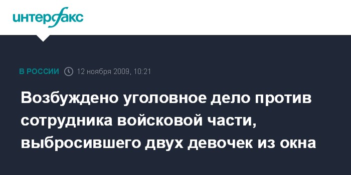 Москва. 12 ноября. INTERFAX.RU - В СКП РФ подтверждают факт возбуждения уголовного дела по статье "Убийство" в отношении сотрудника войсковой части, выбросившего в ночь на четверг из окна двух восьмилетних девочек.