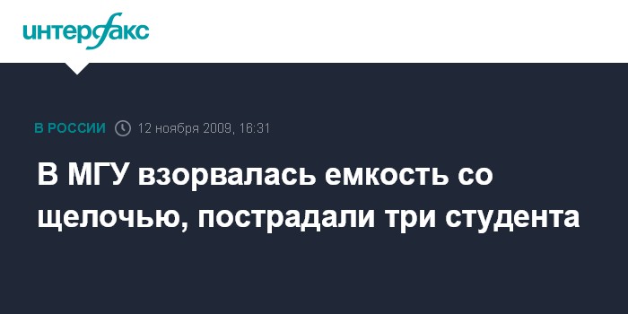 Москва. 12 ноября. INTERFAX.RU - В одной из лабораторий МГУ имени Ломоносова по неустановленным причинам во время занятий взорвалась емкость со щелочью объемом один литр, в результате пострадали три студента, сообщил "Интерфаксу" источник в правоохранительных органах столицы.