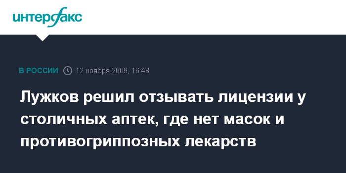 Москва. 12 ноября. INTERFAX.RU - Мэр Москвы Юрий Лужков принял решение отзывать лицензии у столичных аптек, в которых нет противогриппозных повязок (масок) и лекарств.