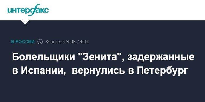 Москва. 28 апреля. INTERFAX.RU - Трое болельщиков "Зенита", задержанные в феврале испанской полицией после матча 1/16 финала Кубка УЕФА между петербургским клубом и "Вильярреалом", вернулись в конце прошлой недели в Cанкт-Петербург.