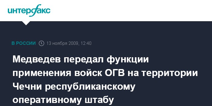 Москва. 13 ноября. INTERFAX.RU - Функции применения подразделений Объединенной группировки войск на Северном Кавказе на территории Чечни возложены на оперативный штаб Чеченской республики.