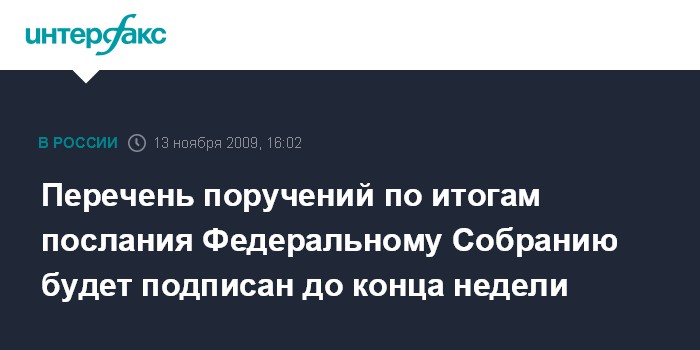 Москва. 13 ноября. INTERFAX.RU - Президент РФ Дмитрий Медведев до конца недели подпишет перечень поручений, сформированный по итогам ежегодного послания главы государства Федеральному Собранию.