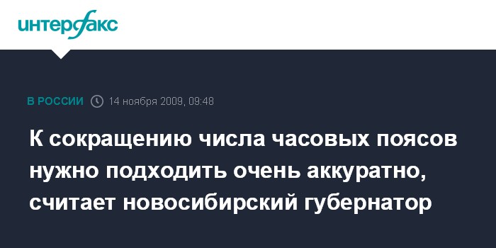 Новосибирск. 14 ноября. ИНТЕРФАКС-СИБИРЬ - Вопрос о сокращении часовых поясов в России требует точных подходов, но эта мера может дать положительный эффект, заявил журналистам новосибирский губернатор Виктор Толоконский.