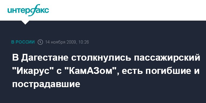 Москва. 13 ноября. INTERFAX.RU - По предварительным данным, шесть человек погибли в результате столкновения пассажирского "Икаруса" и грузового "КамАЗа" на автодороге Сулак-Махачкала в Дагестане.