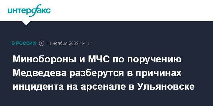 Москва. 14 ноября. INTERFAX.RU - Президент РФ Дмитрий Медведев поручил МВД и МЧС разобраться в причинах происшествия на склада боеприпасов в Ульяновске, а также в двухнедельный срок провести обследование подобных объектов на соответствие действующим правилам их функционирования.