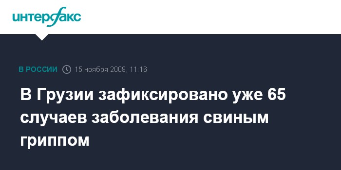 Тбилиси. 15 ноября. INTERFAX.RU - Шесть новых случаев заболевания вирусом свиного гриппа зафиксировано в Грузии за последние сутки. Как сообщает грузинская телекомпания "Рустави-2", четверо заболевших граждан прибыли в Грузию из-за рубежа, а двое заболели после контакта с инфицированными. На сегодняшний день в Грузии официально зафиксировано уже 65 случаев заболевания вирусом свиного гриппа.