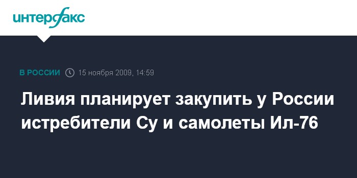Дубаи (ОАЭ). 15 ноября. INTERFAX.RU - Ведутся переговоры о закупке Ливией российской авиационной техники, сообщил на открывшемся в ОАЭ авиасалоне "Дубаи Аэрошоу-2009" директор по особым поручениям ФГУП "Оборонэкспорт", глава делегации предприятия Михаил Завалий. "Ливия проявляет интерес к закупке нашей авиационной техники, в частности истребителей марки Су и военно-транспортных самолетов Ил-76", - сказал М.Завалий в воскресенье "Интерфаксу-АВН". По его словам, в настоящее время ведутся переговоры о техническом облике предлагаемых для поставки машин.