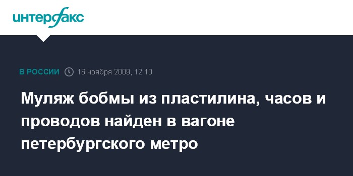 Москва. 16 ноября. INTERFAX.RU – На конечной станции "синей" ветки петербургского метро "Парнас" в вагоне поезда обнаружен муляж взрывного устройства, сообщает сайт МВД РФ в понедельник.