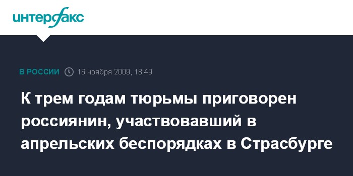 Париж. 16 ноября. INTERFAX.RU - Суд во французском Страсбурге приговорил в понедельник к трем годам тюрьмы и еще одному году условного заключения россиянина за участие в беспорядках в апреле этого года.