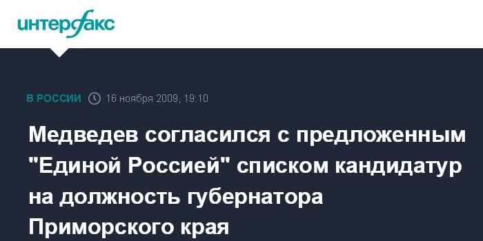 Москва. 16 ноября. INTERFAX.RU - Президент России Дмитрий Медведев согласился со списком кандидатур (Сергей Дарькин, Владимир Курилов, Юрий Сентюрин, Валерий Сухих), предложенных партией "Единая Россия" на должность губернатора Приморского края.
