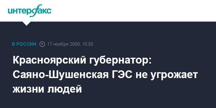 Москва. 17 ноября. INTERFAX.RU – Губернатор Красноярского края Александр Хлопонин считает, что необходимо активней информировать население о безопасности Саяно-Шушенской ГЭС.