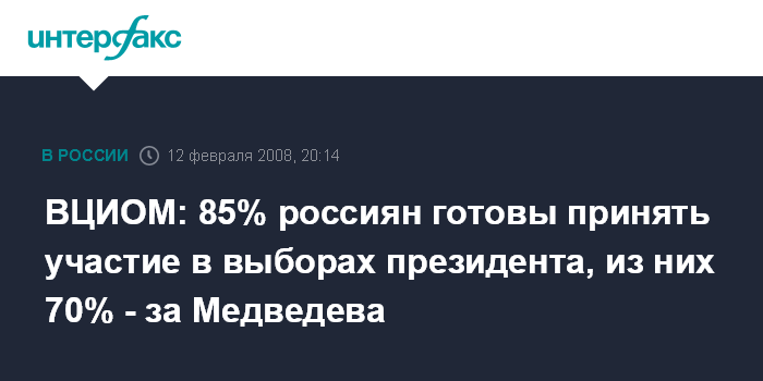 ВЦИОМ: 85% россиян готовы принять участие в выборах президента, из них 70% - за Медведева