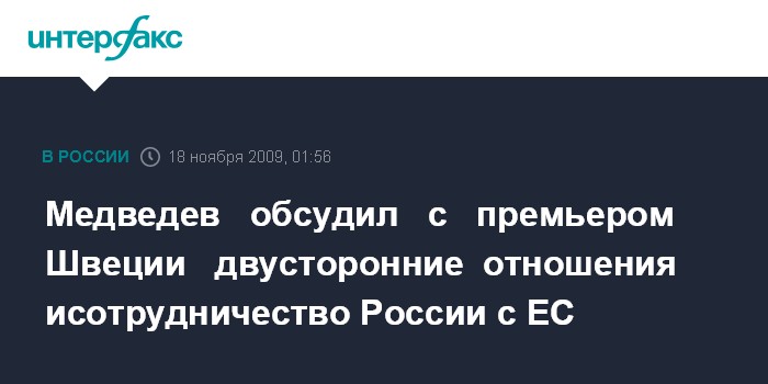 Медведев обсудил с премьером Швеции двусторонние отношения исотрудничество России с ЕС