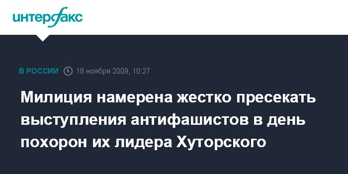 Москва. 18 ноября. INTERFAX.RU – Милиция ожидает массовых акций антифашистов в день похорон одного из их лидеров Ивана Хуторского, убитого неизвестными 16 ноября в Москве, сообщил в среду "Интерфаксу" источник в правоохранительных органах города.