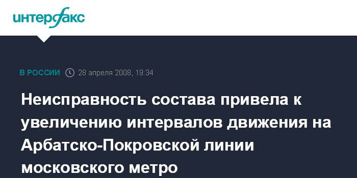 Москва. 28 апреля. ИНТЕРФАКС-МОСКВА - Из-за неисправности состава на Арбатско-Покровской линии московского метрополитена в понедельник вечером поезда на линии шли с увеличенными интервалом, сообщили "Интерфаксу" в пресс-службе столичной подземки.