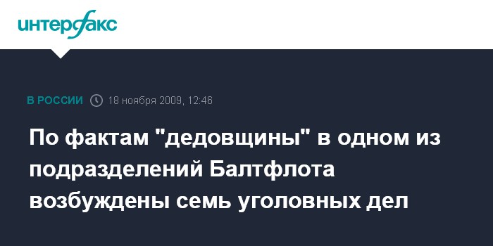 Москва. 18 ноября. INTERFAX.RU - Проверка военной прокуратуры подтвердила факты неуставных взаимоотношений в одном из экипажей Балтийского флота, дислоцированного в Пионерском (Калининградская обл.), сообщает Главная военная прокуратура. Согласно сообщению, поступившему в "Интерфакс-АВН" в среду, военными следственными органами по результатам проверки в период с 5 по 13 ноября "возбуждено и расследуется семь уголовных дел".