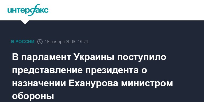 Москва. 18 ноября. INTERFAX.RU - В Верховную Раду в среду поступило представление президента Украины Виктора Ющенко о назначении Юрия Еханурова министром обороны. Проект соответствующего постановления зарегистрирован на официальном сайте парламента.