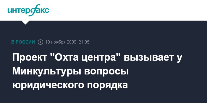 Москва. 18 ноября. ИНТЕРФАКС - Министерство культуры и Росохракультура ждут от прокуратуры заключения по вопросу соблюдения законности при проектировании "Охта центра" в Санкт-Петербурге.